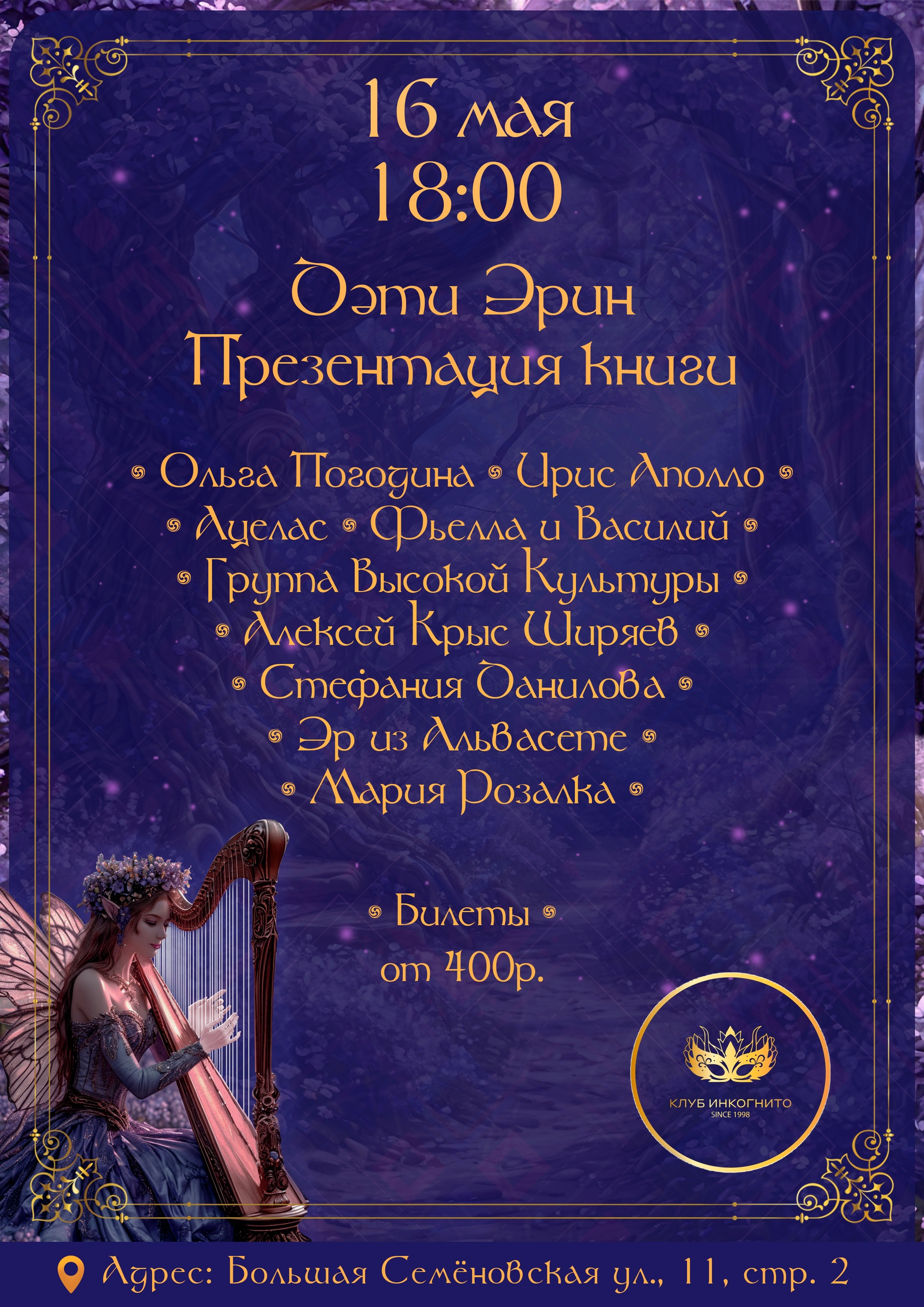 Яркое музыкально-поэтическое событие в самом центре Москвы, посвященное выходу сборника стихов известной поэтессы Ники Батхен. Книга и программа перенесет зрителей в мир сказочной Ирландии, расскажет о волшебстве, которое, не смотря ни на что, находит лазейки в нашу реальность. На сцене клуба "Инкогнито" прозвучит ирландская народная музыка и фэнтэзи-фолк, и, разумеется, стихи, уводящие слушателей в Волшебную страну древних легенд